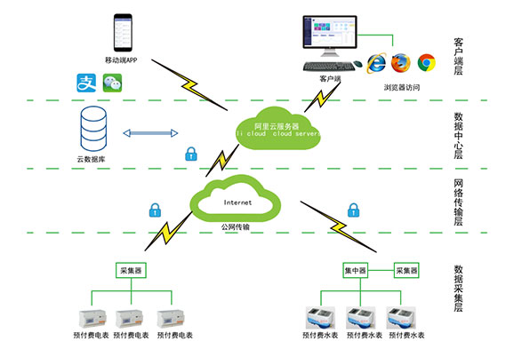 對于分布不同省、地市或同地市不同區(qū)域的連鎖商業(yè)、集團(tuán)、百貨、門店、物業(yè)、院校等業(yè)務(wù)分散,要求集中管理、線上支付,低額提醒、欠費告警。但常規(guī)的本地插卡付費、本地預(yù)付費并不能完全滿足客戶管理需求,預(yù)付費云平臺應(yīng)運而生。AcrelCloud-3200水電預(yù)付費云平臺無縫集成商業(yè)、物業(yè)公司、集團(tuán)企業(yè)、院校等分散布置的安科瑞DDSY/ADF系列電子式預(yù)付費電能表、閥控智能水表等,提供微信、支付寶、銀聯(lián)等可選的在線支付方式,大大方便了用戶充值、圈存,提供預(yù)警和充值、退費、電能消耗等記錄查詢,方便用戶和管理方的數(shù)據(jù)統(tǒng)計和財務(wù)分析,提供先交費后使用的管控機制,大大降低了管理部門的收費成本。